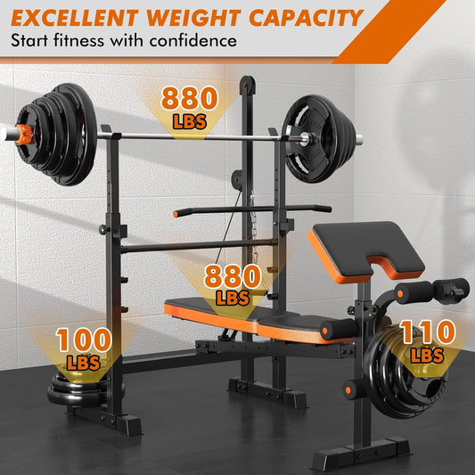 Bench Press Set, 880LBS Adjustable Weight Bench with Leg Extension and Preacher Curl Pad, 8 IN 1 Multi-Function Gym Bench with LAT Pulldown Pulley System, Full-Body Workout Home Gym Equipment