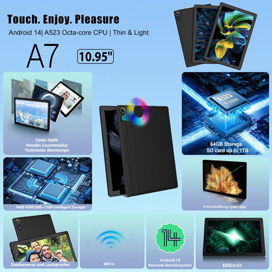Bestski Android 14 11inch Tablet , Octa-Core Processor,16GB RAM + 128GB ROM,FHD IPS Display,Face Unlock 6800Amh,5+8 MP with Colorful Lights,Black