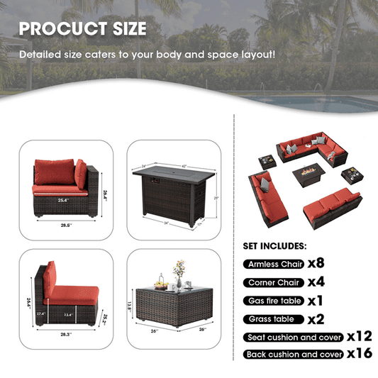 Gaildon 15 Pieces Patio Furniture Set with Fire Pit Table, All Weather Outdoor Sectional PE Rattan, Patio Conversation Sets Cushions & Black-glass Coffee Table for Garden Lawn Balcony Porch Deck,Red