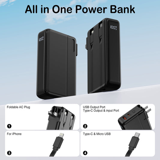 OWNTECH 10000mAh Portable Charger with Built-in Cable & AC Wall Plug, 4-Output LCD Display, Fast Charging Power Bank, Compatible with iPhone Android Smartwatch