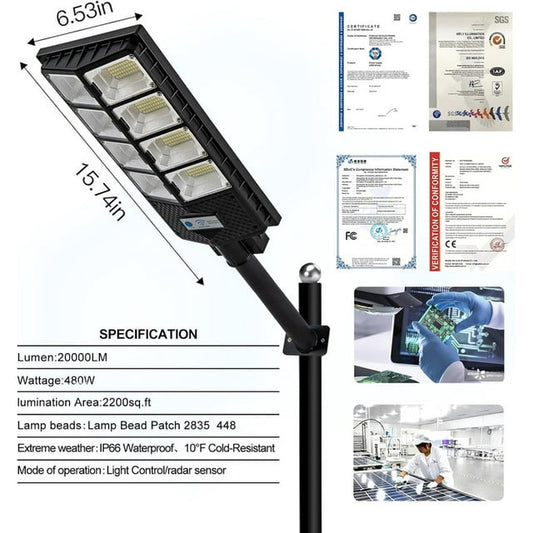 Solar Outdoor Lights, 448LEDs Street Lights with 20000LM Hight Brightness, IP66 Waterproof Security Flood Light, Dusk to Dawn Solar Street Lights