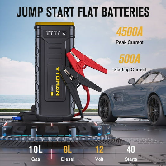 VTOMAN 4500A Portable Car Jump Starter - 12V Booster for 10L Gas/8L Diesel, Dual USB+LED