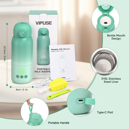 Vipuse Portable Bottle Warmer for Travel, Dual Heating Modes for Breast Milk and Water,12 OZ Portable Milk Warmer,Green