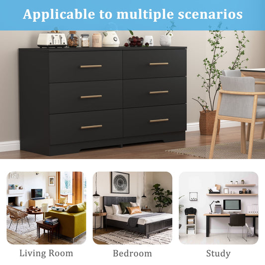 YYAo Wooden 6 Drawer Dresser, Large Modern Chest of 6 Drawers Night Table, TV Stand for 55" TV for Bedroom, Closet, Living Room, Black