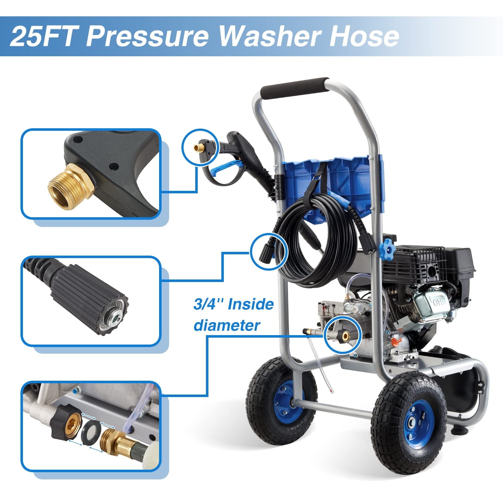 - Easy to Assemble: The main body is divided into 4 parts for quick assembly by one person within 10 minutes. Comes with a 5/8 in. x 25 ft. garden high-pressure hose, 4 quick connect nozzle tips, and a 16 in. spray gun.