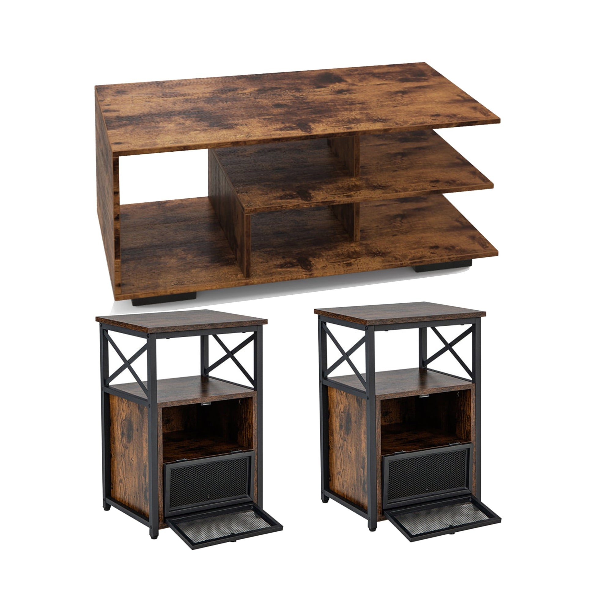 Finihen 3-Piece Industrial Coffee Table Set, Rectangular Coffee Table with L-shaped Middle Shelf & 2 Modern Nightstands with 2 Flip Drawers and Open Shelf, for Living Room, Brown
