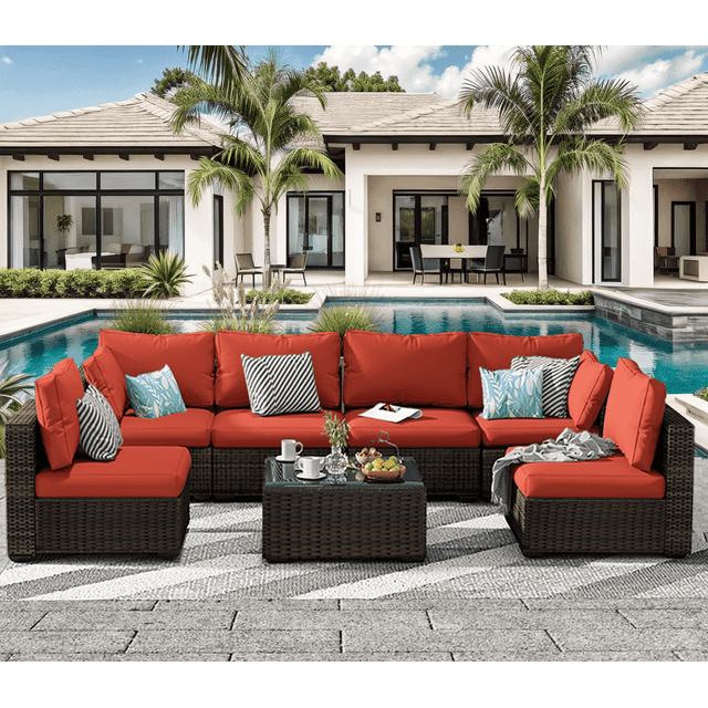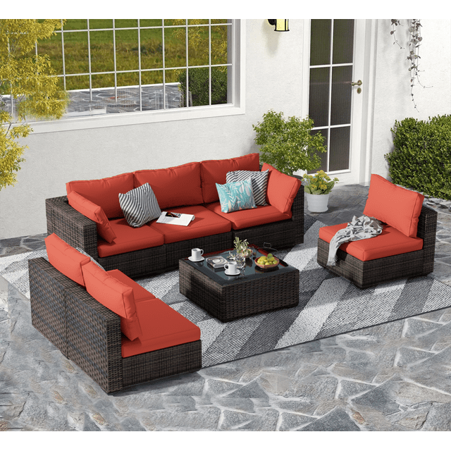 Gaildon 7 Patio Outdoor Furniture Wicker Sectional Sofa Couch Lawn Sectional Black Glass Table, Red