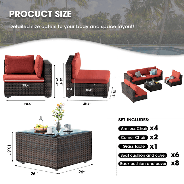 OPTIMAL COMFORT AND NON-SLIP: The ideal space breathes life into the mood and awakens. The outdoor patio sofa set comes with wide and deep seats, which providing ample space. The breathable and thick cushions for optimal comfort and relaxation, which reduce stress in sedentary and immerse yourself in an amazing enjoyable environment. Meanwhile, there are velcros on every seat cushion and ropes on every back pillow to prevent them from sliding off. Leisure furniture for you to live a life of poetry.
