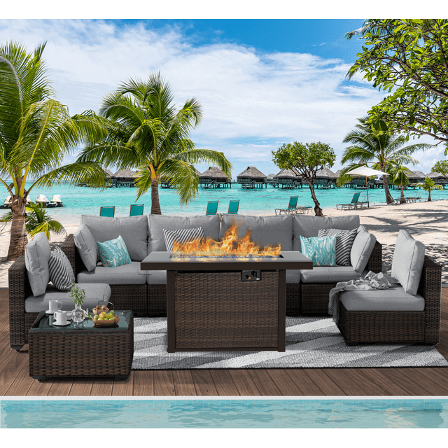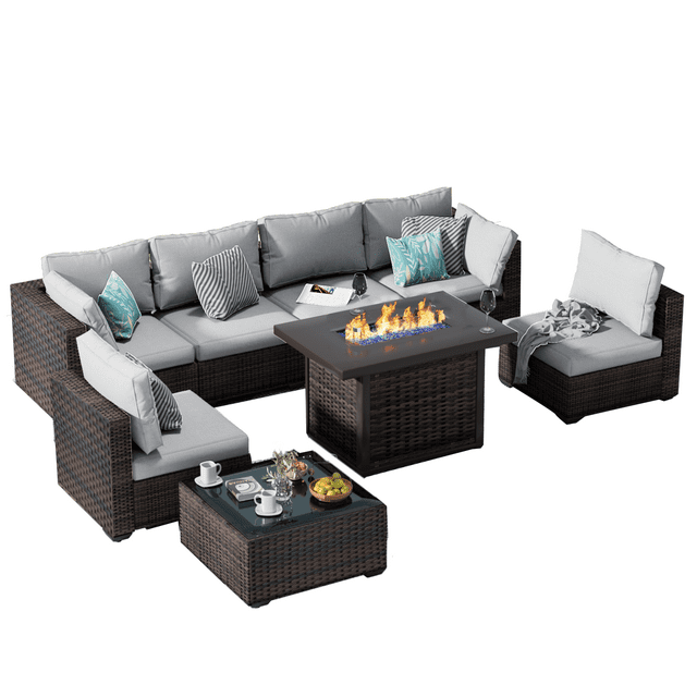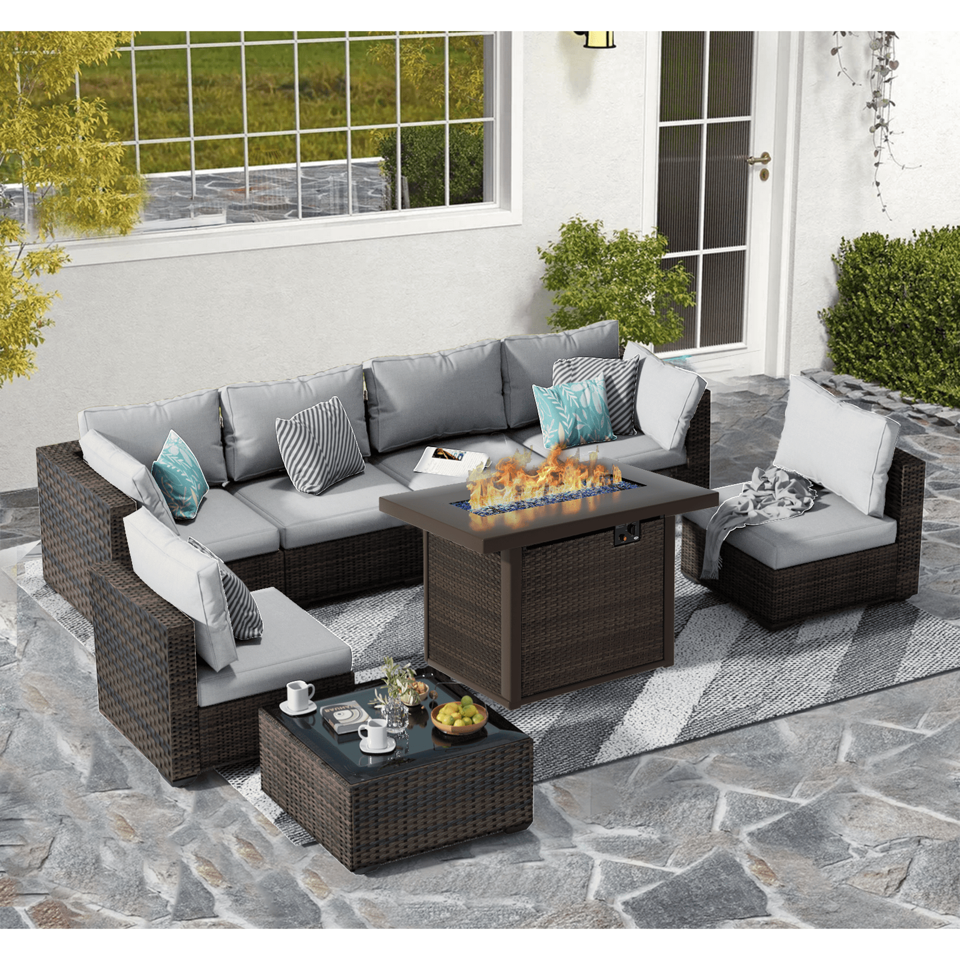 Gaildon 8 Piece Patio Furniture Set with Fire Pit Table, All Weather Outdoor Sectional PE Rattan, Patio Conversation Sets with Cushions and Glass Coffee Table for Garden Lawn Balcony Porch Deck