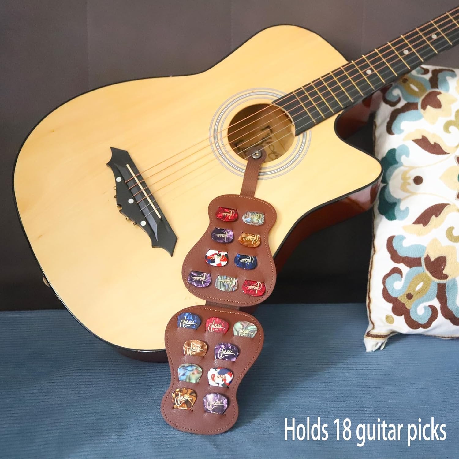 Guitarist Gifts Both the inside and outside of the guitar pick case are made of PU leather. The new high-quality leather case feels smooth and comfortable, has the best touch, and is waterproof and durable. Is not only small and exquisite, but also large in capacity. It can hold 18 guitar picks of different sizes and thicknesses at the same time. This pick rack is less than the size of a palm and is easy to operate. Guitar Plectrum Bag