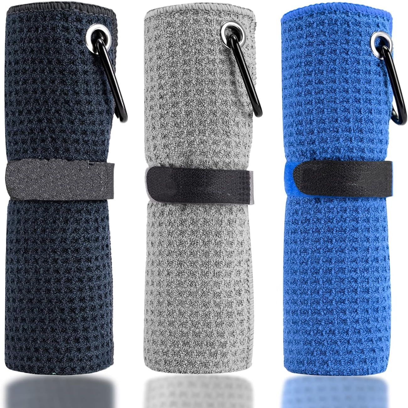 Genreen Microfiber Golf Towel (16" X 16") with Carabiner Clip, Waffle Pattern Golf Towel Hook and Loop Fastener - The Convenient Golf Cleaning Towel Black/Grey/Blue