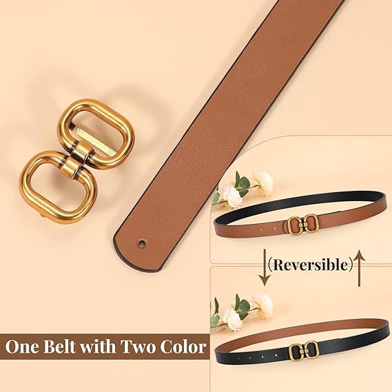 Reversible Leather Belt: One belt with two colors. This women leather belt is reversible. Double side belt strap can be changed by remove the gold buckle and reverse it to another side you can get a different color belt. It is easy to use and meet your different outfit.Elegant&Vintage Belt: This reversible gold buckle belt is made of quality PU leather, soft comfortable and durable. The women leather belt design with a removable vintage snap gold buckle. It makes the entire belt look vintage and fashionable.