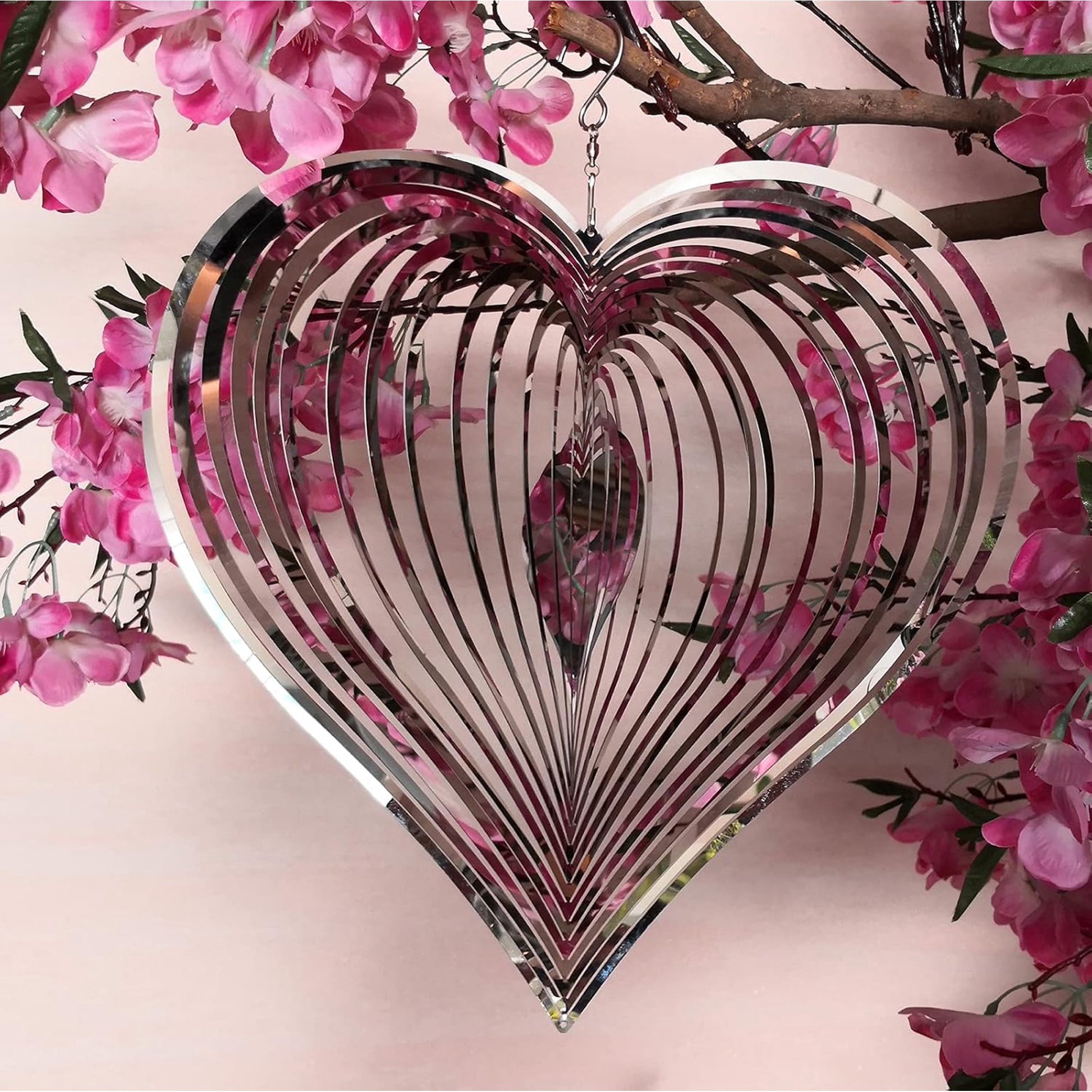 Hanging Wind spinners Beautiful and Pretty Love Heart design with a glittering ,Automatically spins in the breeze,This Visual Art Piece will definitely catch some eyeballs. Large 12 inches size which makes it visible even from a distance. Please put it in a windy place and rotate like pinwheels when the wind blows.Heart wind spinners for Yard and Garden is strong reflective and show a pulsing, magical, three dimensional effect, it will even gleam at night when only a little bit of light is available.