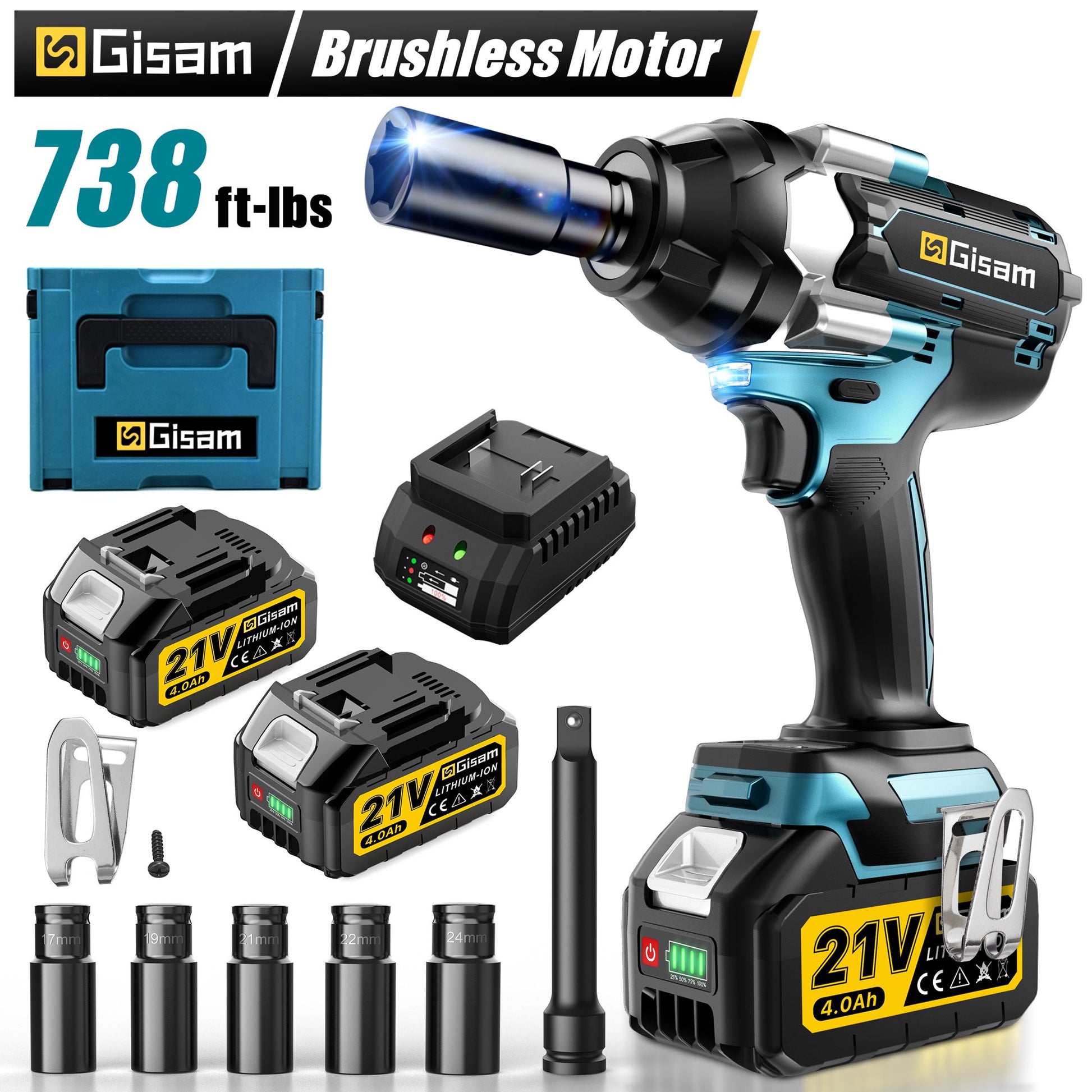 Gisam 1000N.m(738 ft-lbs) Cordless Brushless Impact Wrench,1/2 inch Impact Gun with 2x4.0Ah Batteries & 6 Sockets Accessories ,Pistola De Impacto for Home Car Tire