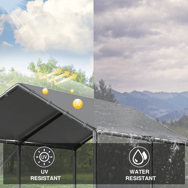 Upgraded Carport: Our large 10'x20' carport not only provides ample space for your vehicles, trucks and boats, but also suitable for outdoor events such as parties, weddings and trade shows. Whether it is hot summer or cold winter, it will provide you with a better shelter. We aim to let you enjoy life anytime, anywhere Heavy-Duty Durable Frame: We use heavy duty 1.5-inch (diameter) powder coated rust-resistant steel metal frame and thickened connectors to increase the stability of the car headliner. The double-sided process protects the steel surface from flaking, chipping, rust and corrosion. Using high-temperature pearlescent paint, the metal carport has better adhesion and a longer service life. Steel Frame: The metal frame connection adopts artistic welding process, which is strong and durable enough to withstand all kinds of bad weather. Elastic ball straps secure the canopy to the frame, with ground stakes for extra support and to protect your belongings from the elements. HIGH DENSITY WATERPROOF COVER: Our garage is made of 200g durable high-density polyethylene fabric, which is UV, water and tear resistant, protecting your vehicle even in bad weather. Bad weather can ruin your day, but don't let it ruin your valuables. Easy to Install and Remove: The carport kit comes with installation instructions, each part is marked with a number, please follow the included instructions to install step by step. The metal pole is attached with a spring button, no additional tools are required, very easy to install and remove. Specifications: Pole Materials: Updated rust-resistant Powder Coating Steel Tube Top peak Height: 8.7ft Sidewall Height: 6ft High-quality material: 180g waterproof tarpaulin with high-density coating technology can protect your car from the sun and wind and rain all year round Wide Usage: perfect for Car, Truck, Party, Wedding, Boats, Storage, Shelter, Horse Shade, Motorcycle, etc.