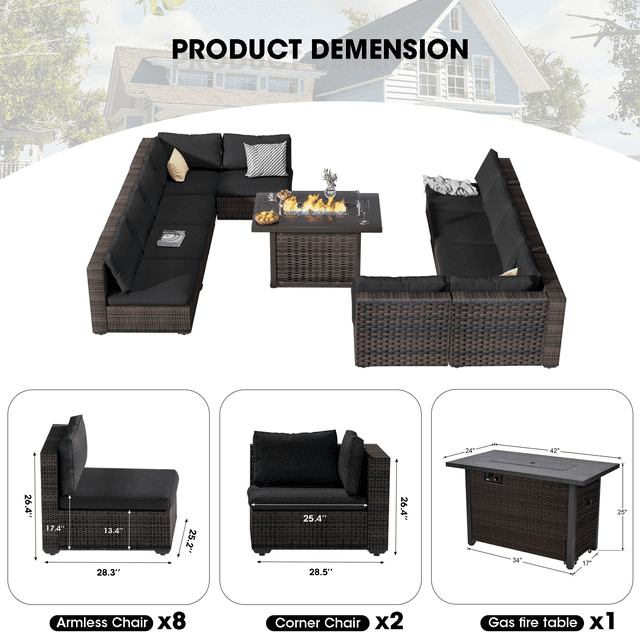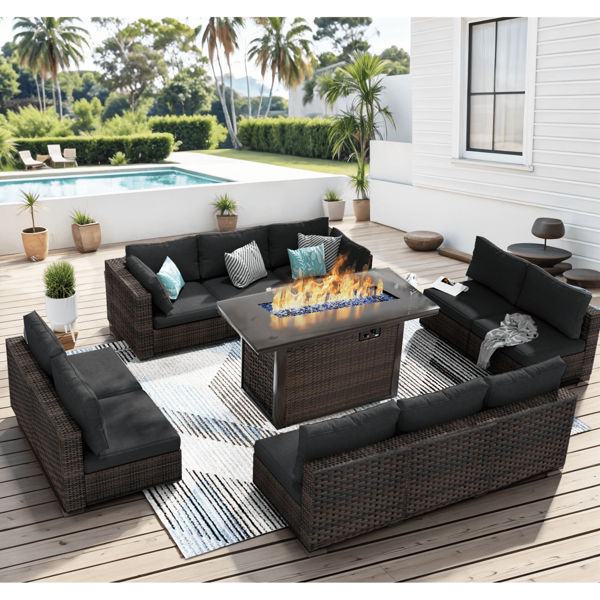 Grezone 11 PCS Outdoor Patio Furniture Set with Fire Pit Table, Wicker Patio Conversation Set, Black