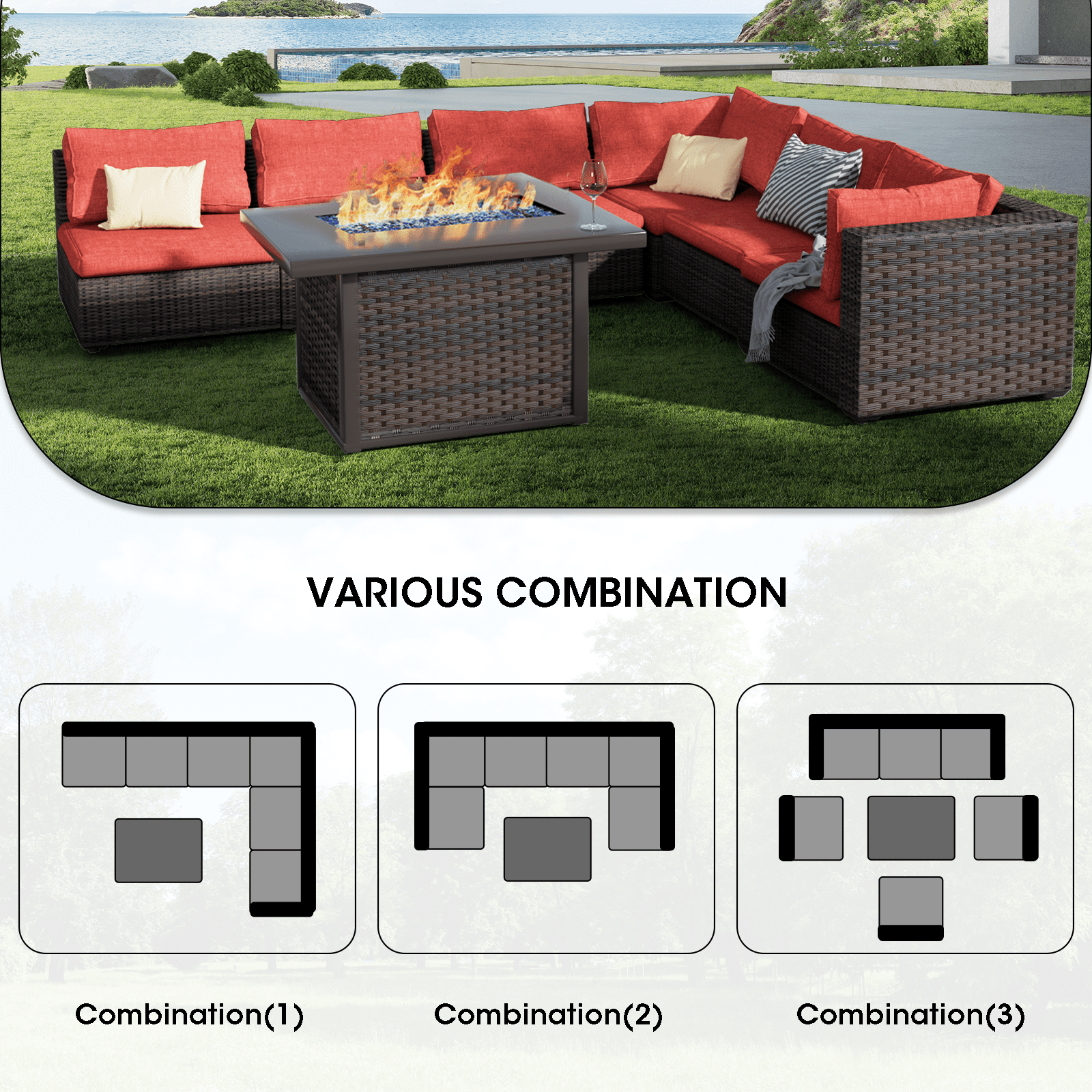Colors Available:Black, Grey, Red, BeigeInclude: sinlge sofas, corner sofas, fire pit table