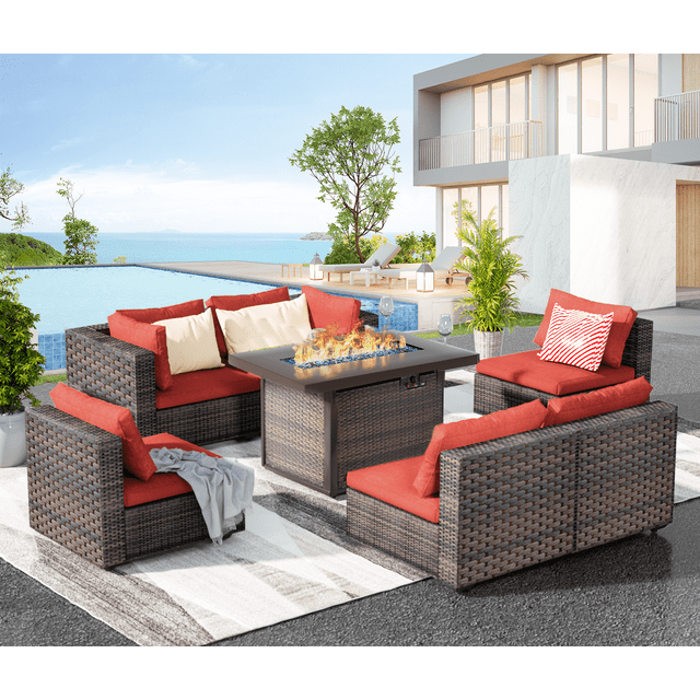 Grezone 7 Pieces Patio Outdoor Furniture Sets All Weather Wicker Sectional Sofa Couch Lawn Sectional Furniture with 43" 55000BTU Gas Propane Fire Pit Table (Red)