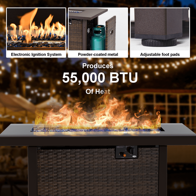 EXPERT CRAFTSMANSHIP & DESIGN: Our outdoor patio furniture set Sturdy metal construction and durable & all-weather PE rattan with unique elegant design, which ensure an excellent longevity and make an attractive centerpiece for your any outdoor living space. IMPORTANT is, the fire pit table top is made of aluminum to prevent rust, it pairs very nicely with chairs, sofas and other pieces in the furniture to create your own casual seating arrangement. Burner and control panel are made of stainless steel for longer service life