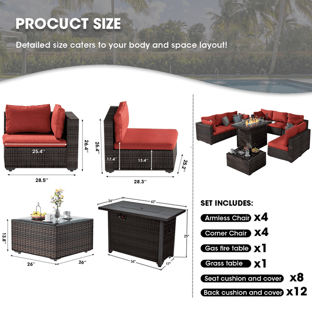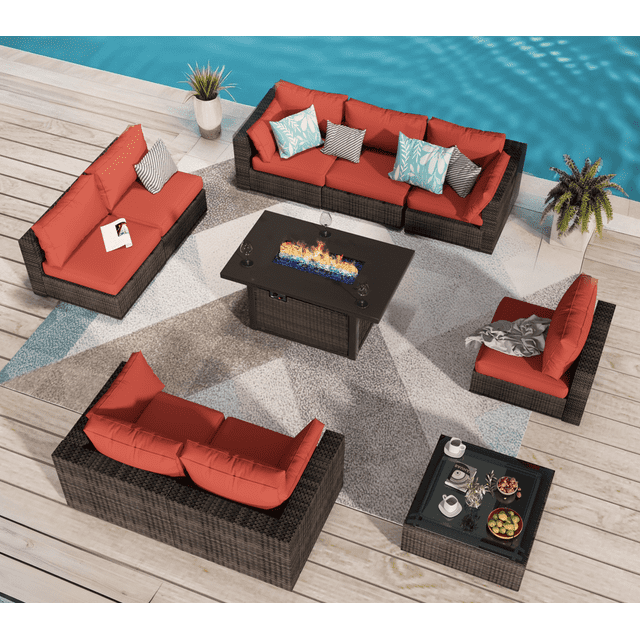 Grezone Outdoor Garden 10 Piece Patio Furniture with 43" 55000BTU Gas Propane Fire Pit Table Rattan Wicker Sectional Set, Red