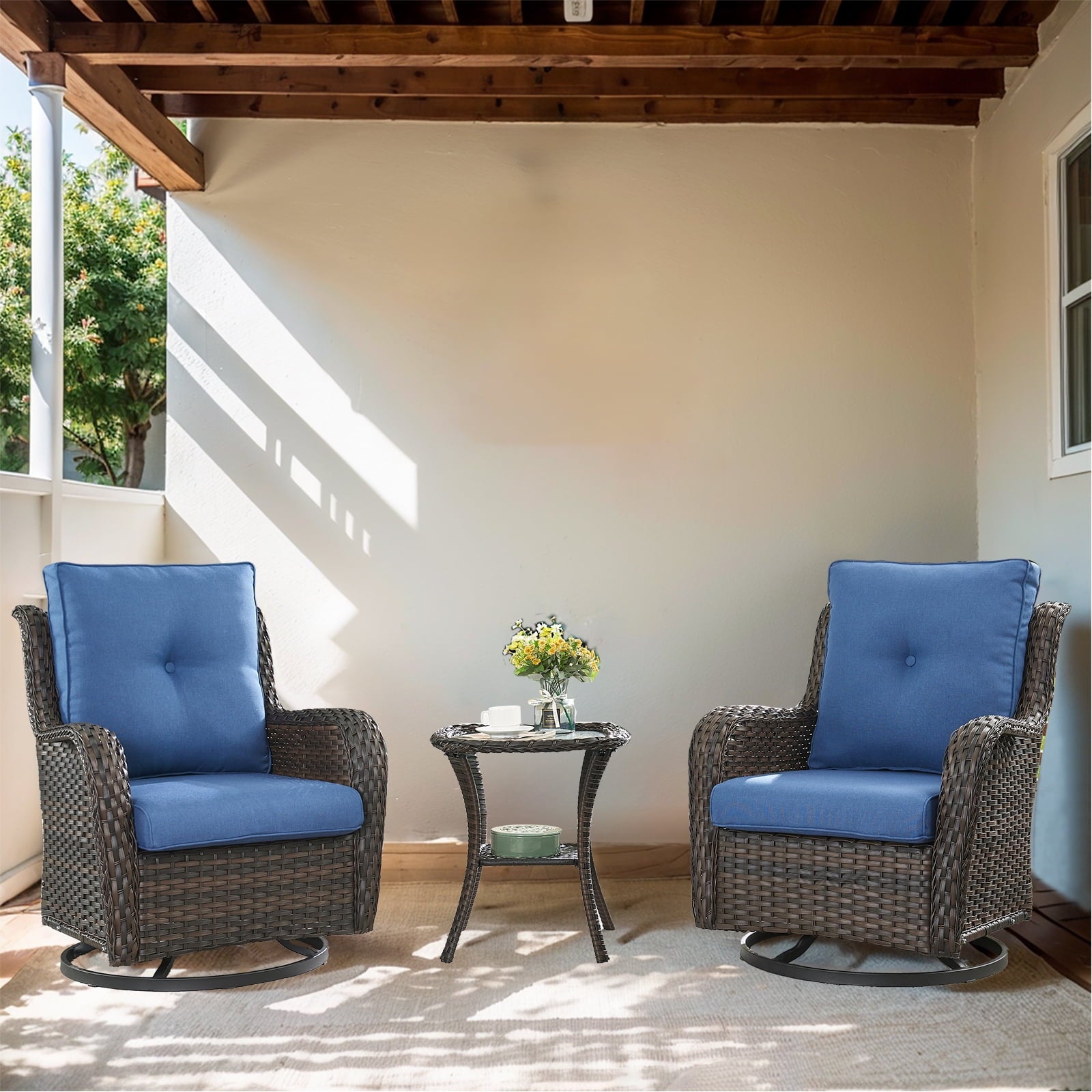 Gymojoy 3 Pieces Outdoor Wicker Swivel Rocker Patio Set,Patio Conversation Set, Swivel Rocking Chairs Set with Side Table( Brown Wicker/Navy Cushion)