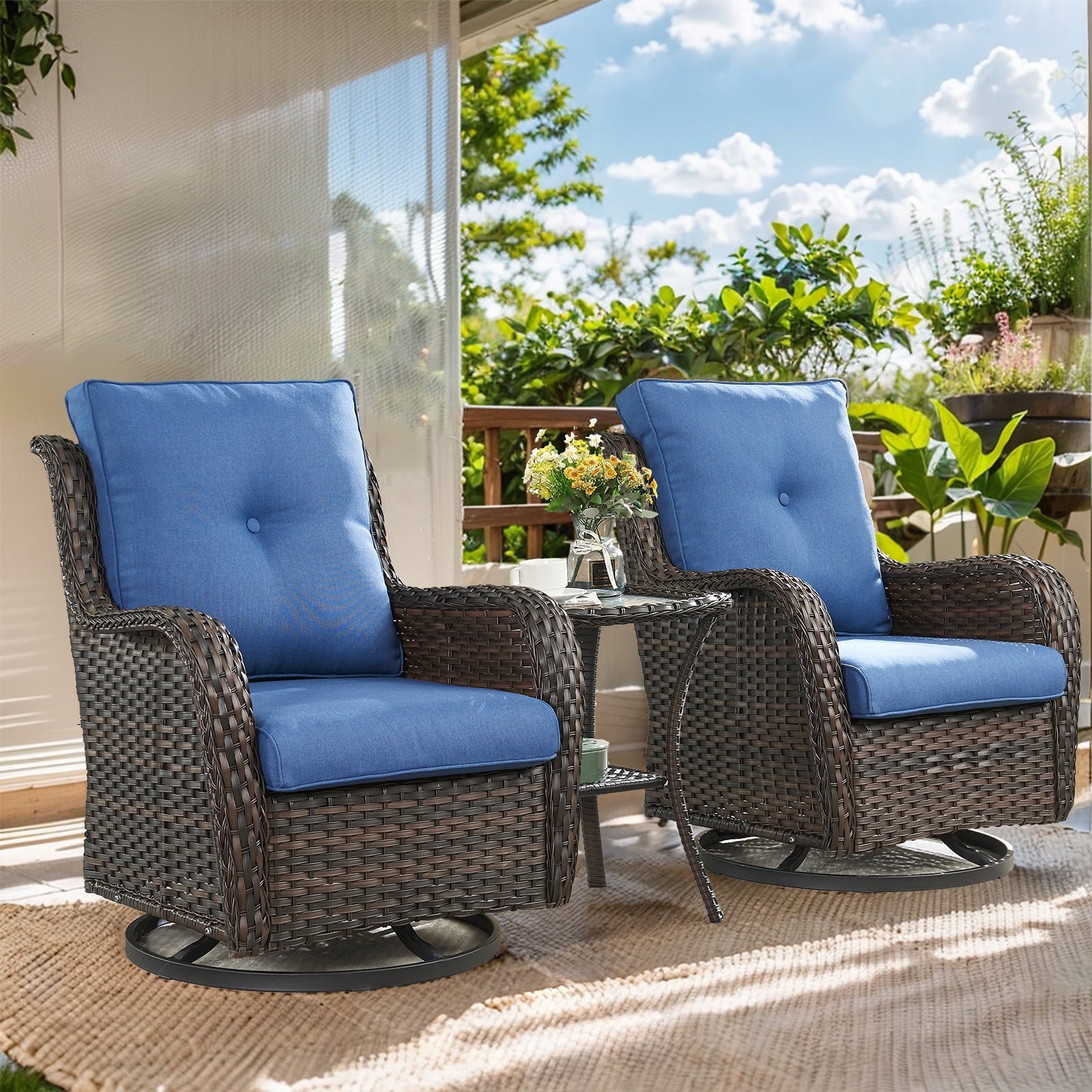 Enhance your outdoor living space with the Outdoor Rocking Chair Set. this set includes 2 hand-woven wicker rocking chairs and a side table, making it perfect for outdoor conversation and relaxation. With a 360° swivel base, you can easily turn and engage in conversations, while the gentle rocking motion creates a relaxing ambiance. The ergonomic structure ensures optimal comfort and support, allowing you to lounge for hours without any discomfort. The curved backrest and armrests provide the perfect balance between style and functionality. these dreamy chairs obviously is a great choice for your yard, deck, patio, porch, garden, poolside, balcony or indoors for season and seasons.