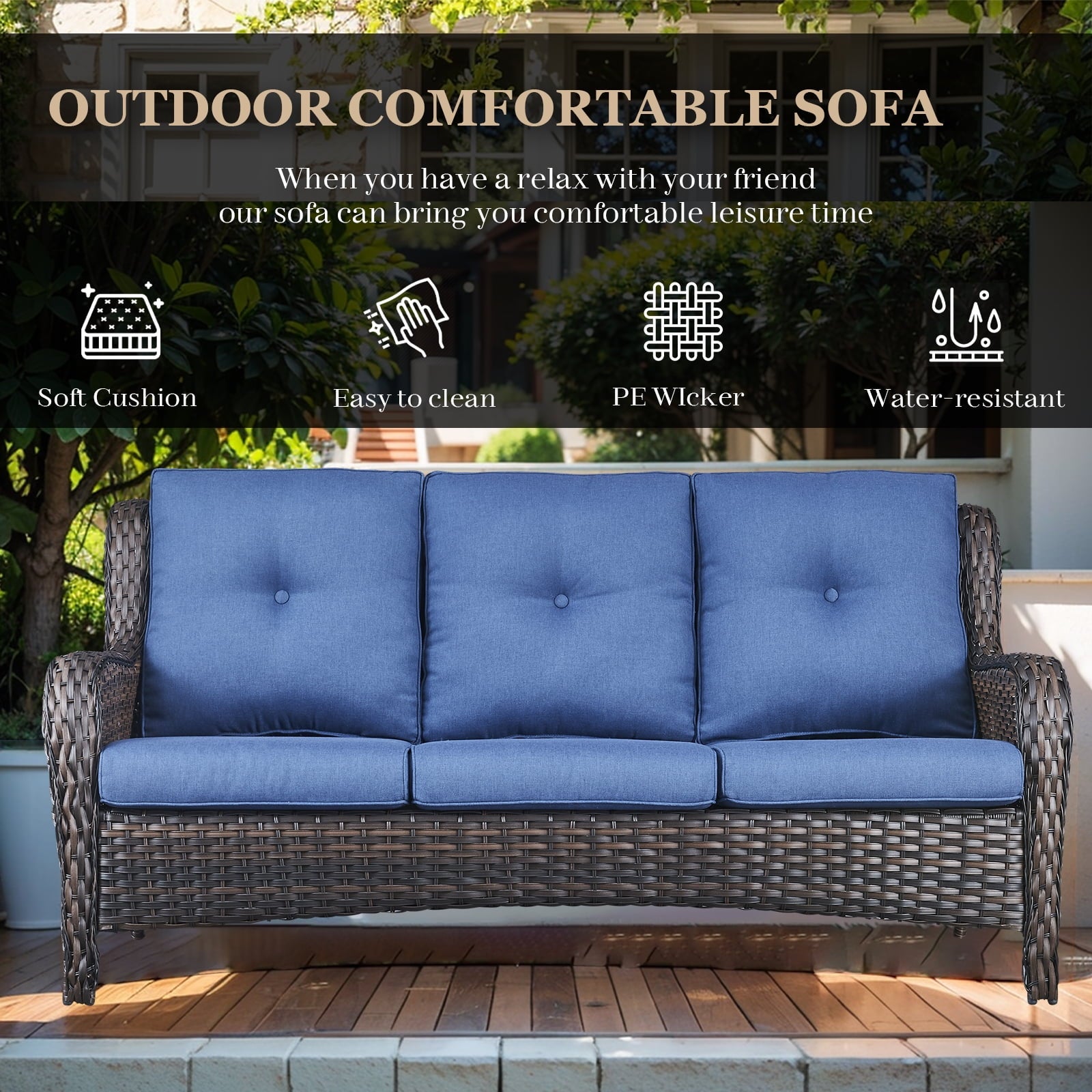 Gymojoy 3-Seat Patio Wicker Sofa Outdoor Rattan Sectional Couch Furniture Steel Frame with High Back,Deep Seat(Brown Wicker & Blue Cushion)