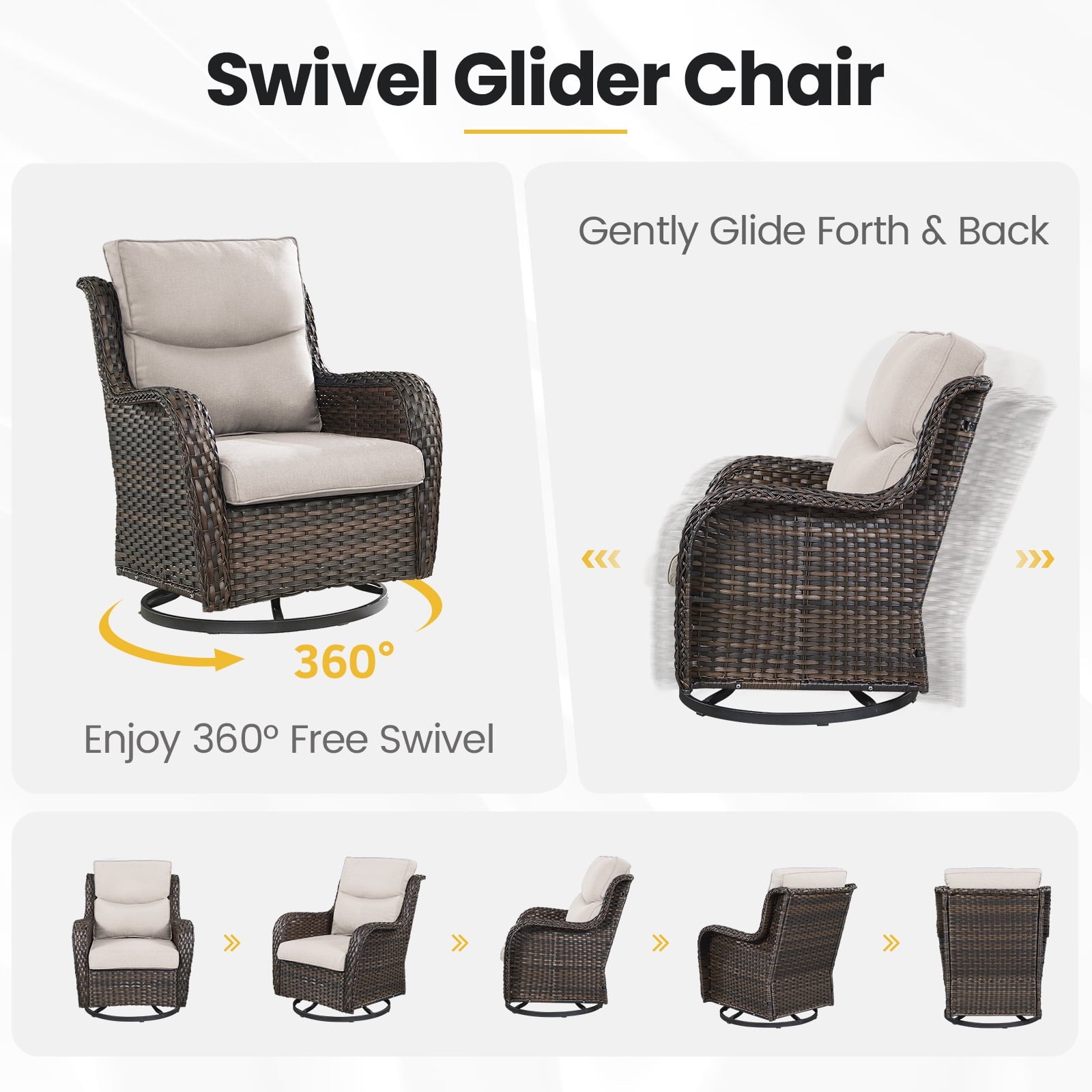 Transform your outdoor space with the Gymojoy Outdoor Swivel Glider, the ultimate in comfort and style. Crafted from high-density PE wicker and reinforced with a heavy-duty powder-coated steel frame. With 360 degree rotation capability. The smooth sliding motion allows you to effortlessly find the most comfortable position, making adjustments simple and convenient. The cushioned seating features an impressive thickness of 5 inches, ensuring you sink into luxury as you unwind. Additionally, ergonomic curved armrests provide exceptional support, accommodating individuals weighing up to 350 lbs.