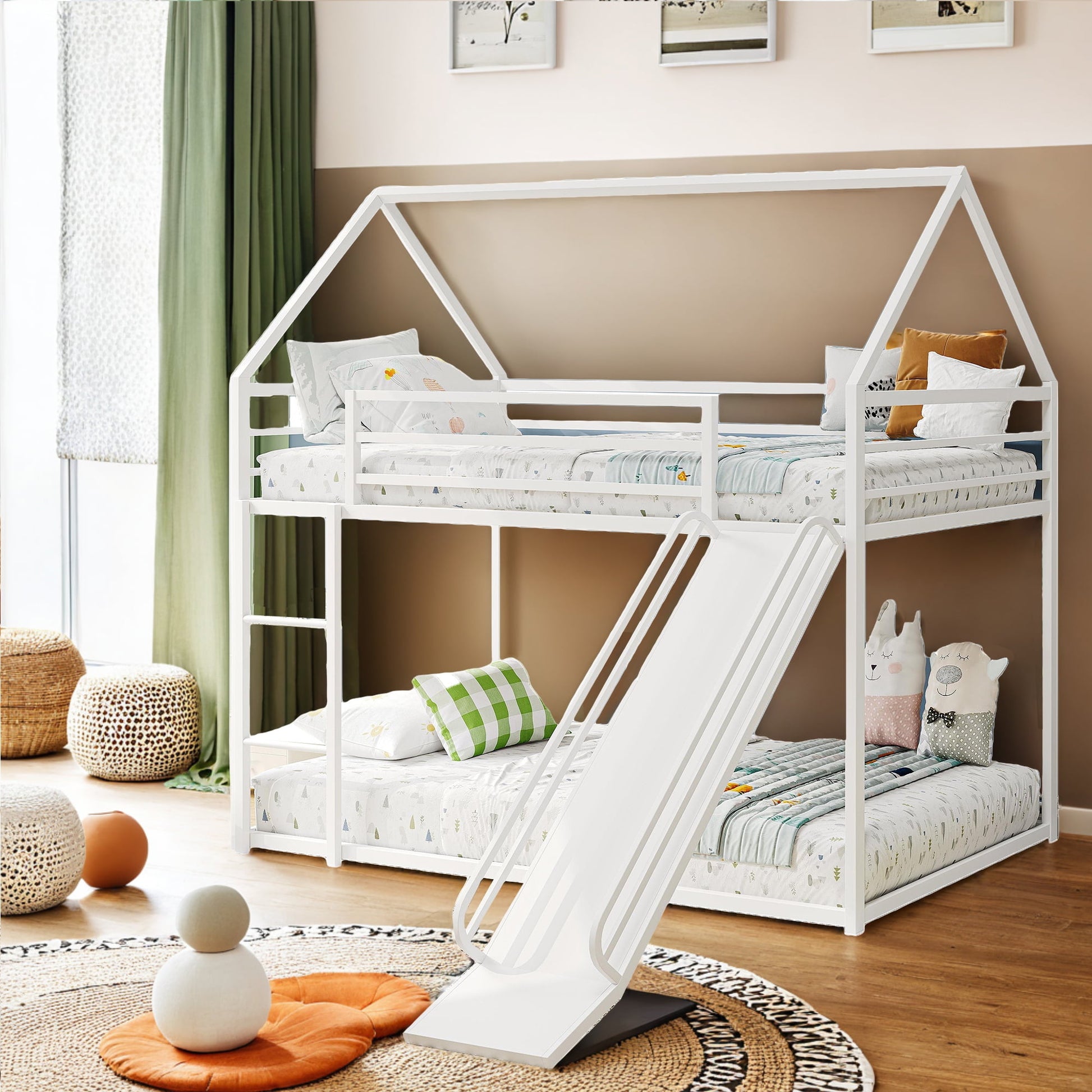 HighSound Metal House Bunk Bed with Convertible Slide, Ladder & Safety Guardrail, Twin over Twin Low Bunk Bed with House Shape & Roof, White