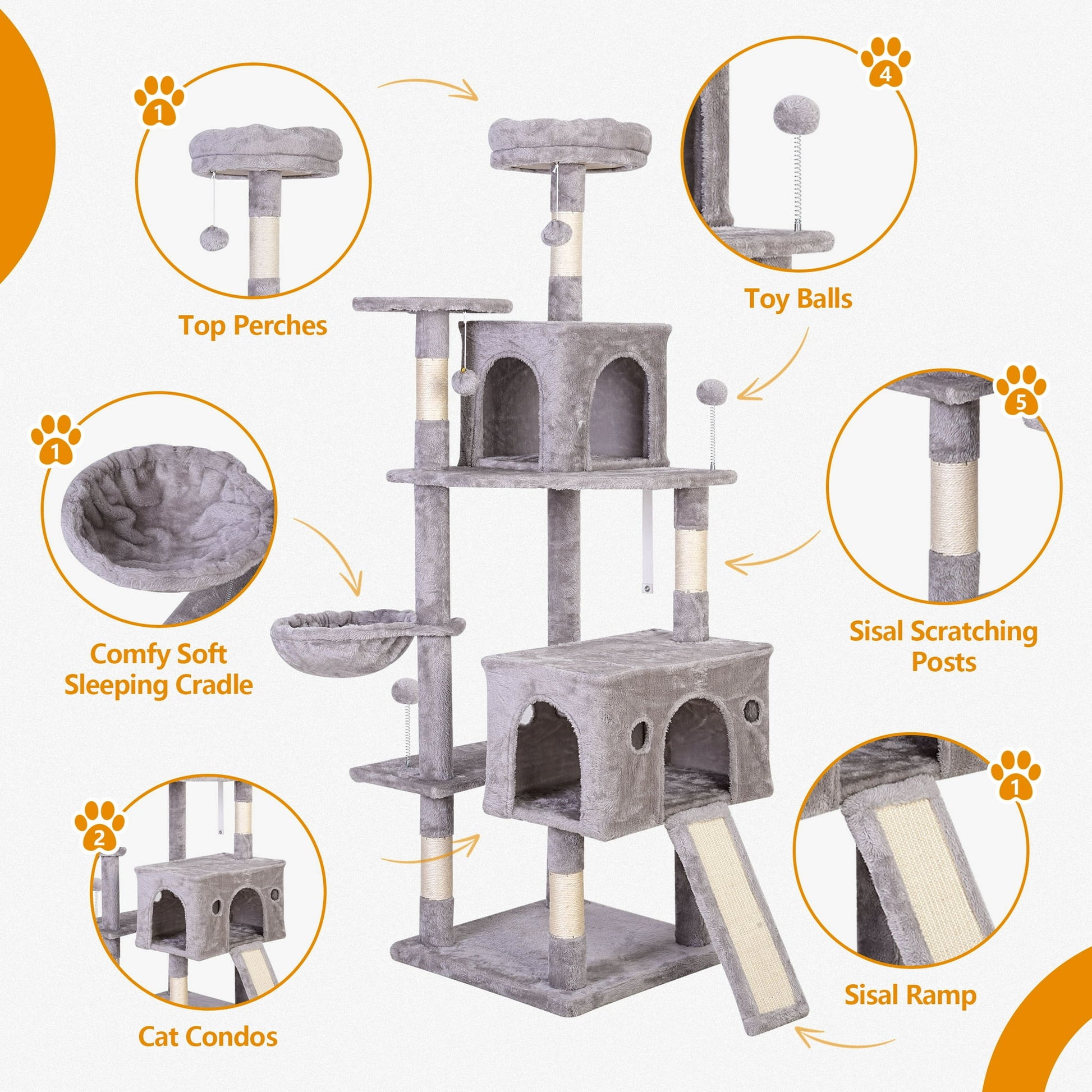 Package Content: Top Perches; Cat Condos; Sisal Ramp; Sisal Scratching Posts; Comfy Soft Sleeping Cradle;Toy Balls