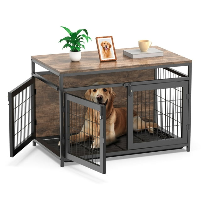HIJOB Dog Crate Furniture, Three-Door Pet Kennel Indoor with Removable Tray, End Table for Home, Heavy Duty Wood Dog Crate House for S/M/L Size Dogs, 37.4" L, Rustic Brown