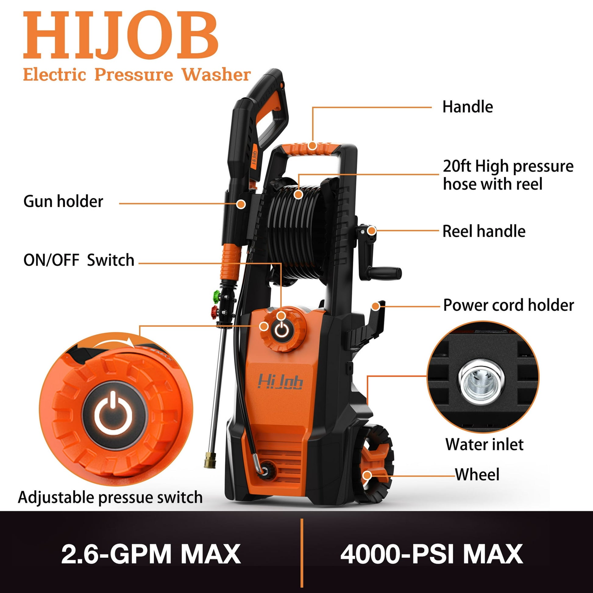 Hijob Electric Pressure Washer is quieter and more powerful than other gas pressure washer. With maximum pressure of 4000 PSI, quite a bit of power up to 2500W, a flow rate of 2.6 GPM, 120V safety voltage, Hijob Power Washer is easy to deep clean patio, car, home, RV, fence, deck, driveway, lawn equipment, etc.