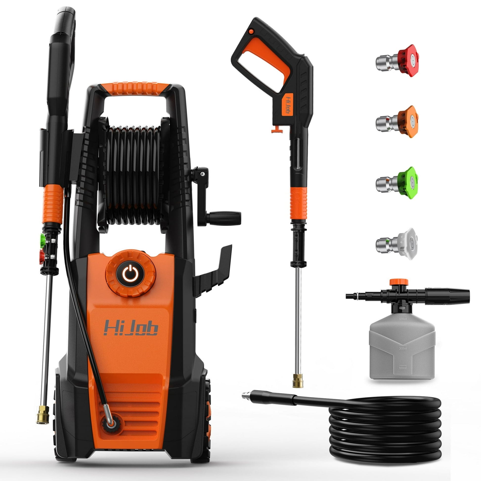 Hijob pressure washer is equipped with 4 quick-connect metal nozzles (0°/15°/25°/40°), including foam cannon and spray gun, which can provide you with a variety of cleaning options, especially in hard-to-reach areas, suitable for residential and commercial use. Whether you are cleaning cars, patios, fences or floors, this pressure washer can meet your needs.