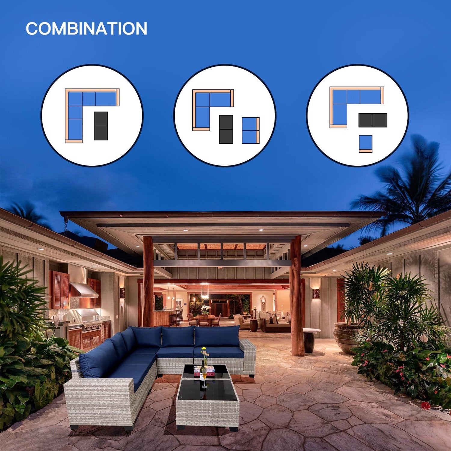 Transform your outdoor space into a vacation paradise in seconds! This high-end gray themed multi color 7-Piece Outdoor Patio Furniture Set creates an elegant yet not dull visual hierarchy through the collision of low saturation blue, black, and gray colors. It easily adapts to various courtyard styles such as Mediterranean style and modern minimalism, perfectly blending into the sparkling waves by the pool. Two corner chairs, four armless chairs, and two tempered glass coffee tables can be combined to create an open L-shaped social space or split into independent resting areas to meet the needs of 4-6 people for family gatherings or afternoon tea with girlfriends. PE rattan like material with rust proof aluminum frame structure is fearless of the outdoor test of hot sun and rainstorm.