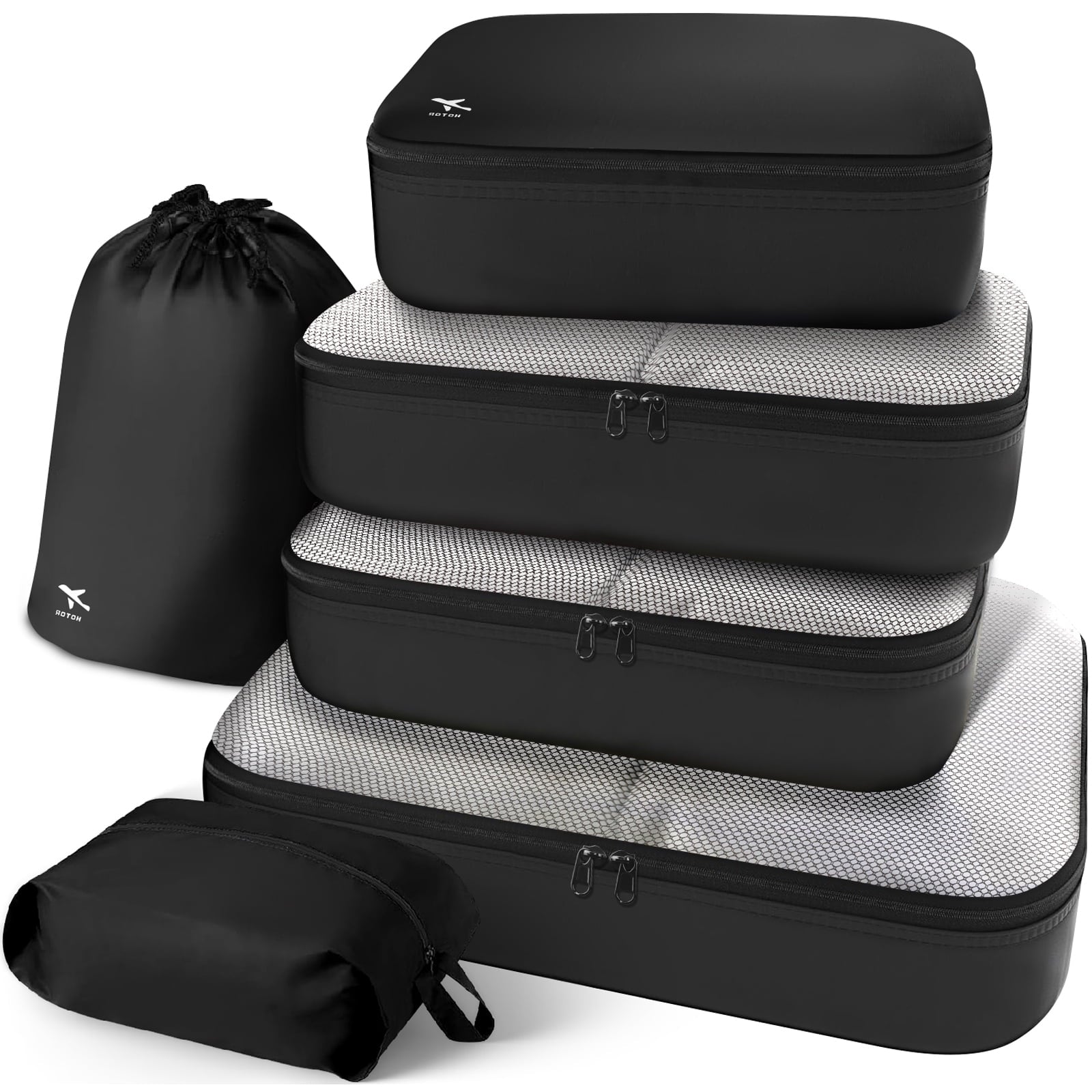 Discover HOTOR's 6-Piece Large Capacity Storage Cubes, perfect for travel! These versatile cubes maximize suitcase space, fitting 20"-28" luggage. Crafted from sturdy, water-resistant fabric with smooth metal zippers, they protect clothes from wrinkles & stains. The breathable mesh design keeps items fresh & visible. Easy to carry & organize, making travel hassle-free!
