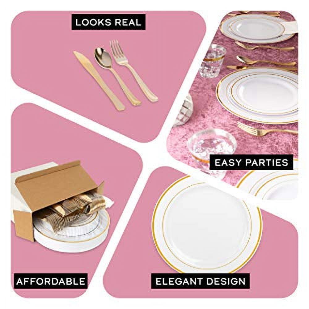 Experience the ultimate solution for hosting any occasion with the Impresserve Disposable Plastic Dinnerware Set. Elevate your table setting into an elegant masterpiece with our comprehensive 125-piece set, designed to cater to up to 25 guests. Our dinnerware set is infused with intricate gold settings and adds sophistication to weddings, bridal showers, birthdays, and other celebrations.
