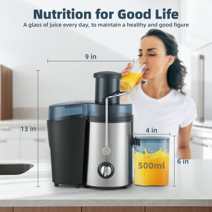 This powerful 400W motor stainless steel juicer features with a unique 3" extra wide chute feed allows you to juice whole fruits and vegetables, reduces your time on prep-cutting and post-cleaning, and keeps the nutritional content of fruits and vegetables intact.