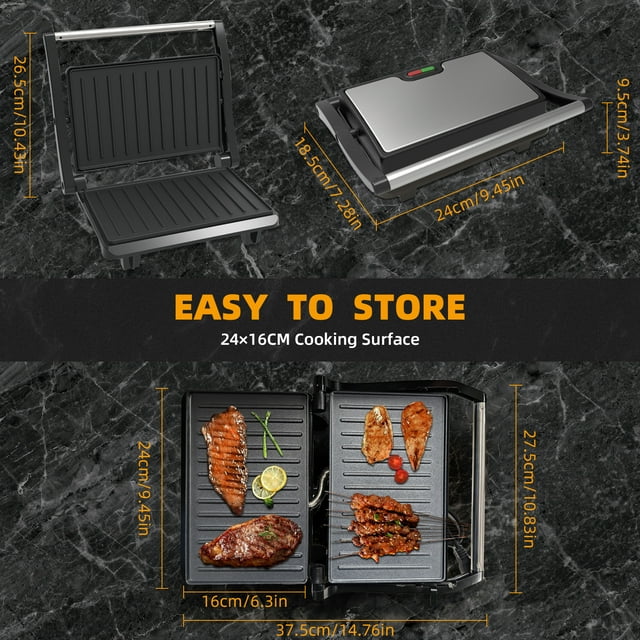 PORTABLE SIZEIdeal for small kitchens, dormitories, offices and even to take with you when travelling! The compact size takes up almost no countertop or shelf space, allowing you to easily store your contact grill.