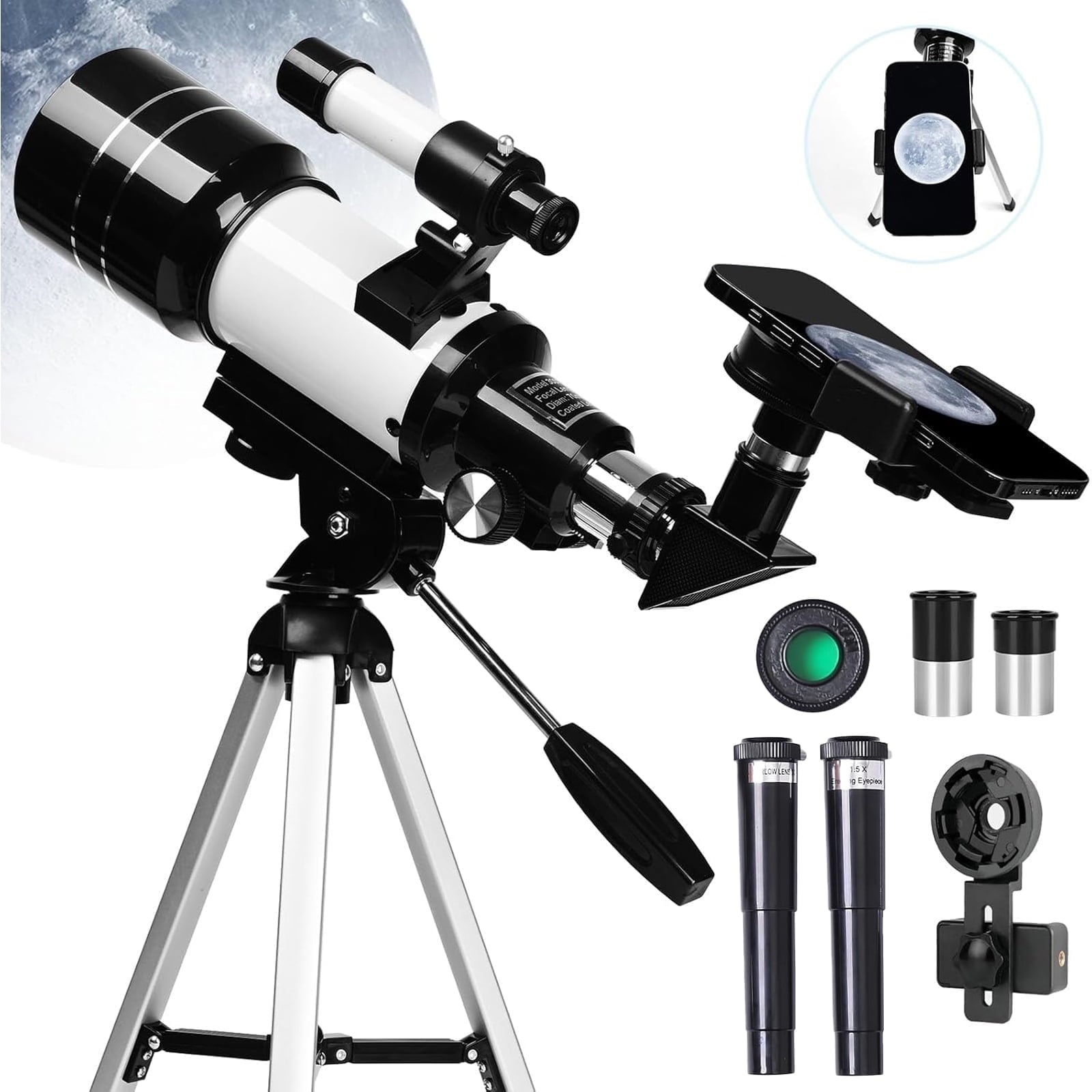 【Powerful Optics】Fully coated lenses with low reflection loss and high light transmission creates stunning images. 70mm aperture and 300mm focal length provides bright, clear images and a wide field of view, suitable for kids and and astronomy beginners to explore planets, the moon, and celestial objects.