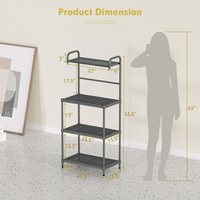-The 4-Tier shelf is multifunctional to store microwave dishes kitchen appliances and something else -The floor-standing rack provides ample storage enhances the utilization of space and occupies less area -Iron frame construction is sturdy heavy-duty and durable -Each open-wire shelf with a dustproof function can bear up to 55 lbs -Rust-resistant outer varnish ensures long-lasting gloss and service time -Smooth surface is easy to clean and keep tidy -Adjustable feet can not only protect the floor but also reinforce stability -Ergonomic handle and lightweight design for easy movement -Suitable for living room home office entryway etc
