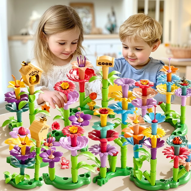 - This style flower garden set helps kids learn about colors and color matching. It also encourages hand-eye coordination and fine motor skills and enhances their creativity and imagination. Children will love to play builder and create their own gardens with this fun and interactive toy set.