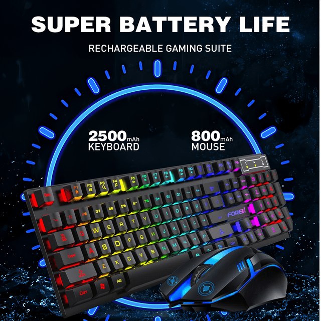 - The keyboard is equipped with a 2500 mAh battery, and the mouse is equipped with an 800 mAh battery. The long battery life allows you to use them continuously for 8 hours with light.
