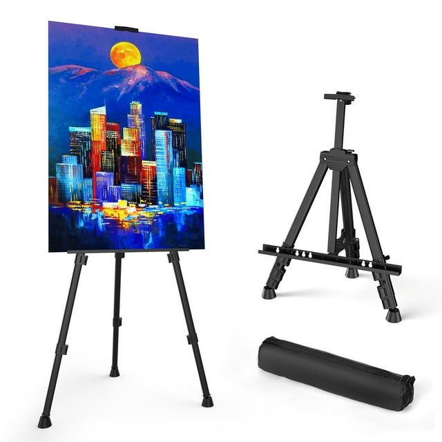 Art Painting Display Easel Stand - Portable Adjustable Aluminum Metal Tripod Artist Easel with Black Bag Adjustable Height: 17" to 59" - Perfect for floor stand or tabletop display, Folds to only 17" for easy storage and transporting, Easy turn knobs for quick height/angle adjustments