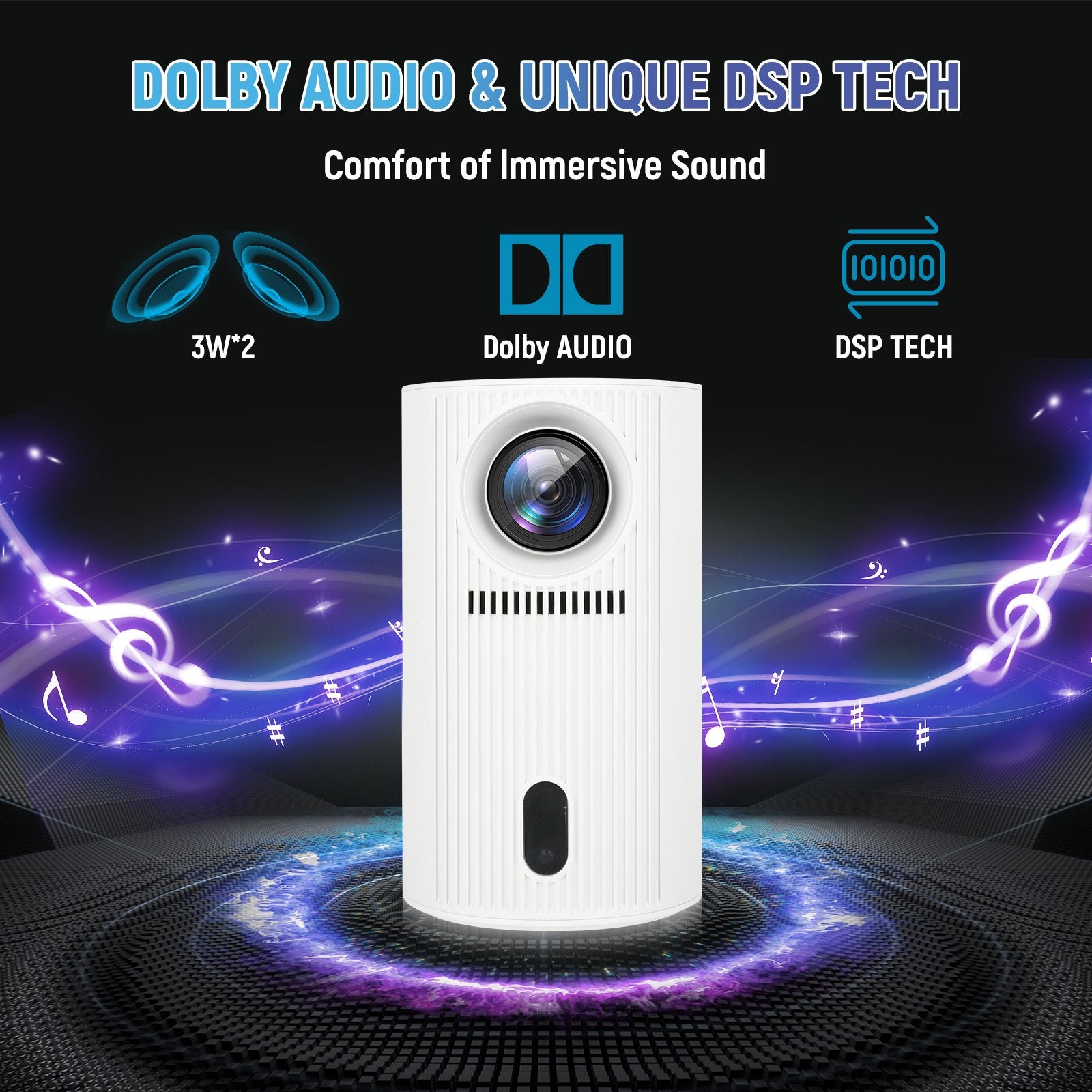 - The portable projector has built-in Bluetooth 5.0 chip and speakers. You can enhance the sound by pairing the projector with headphones, speakers or other audio devices via Bluetooth technology, or you can enjoy a comfortable audio-visual experience directly through the projector's speakers.