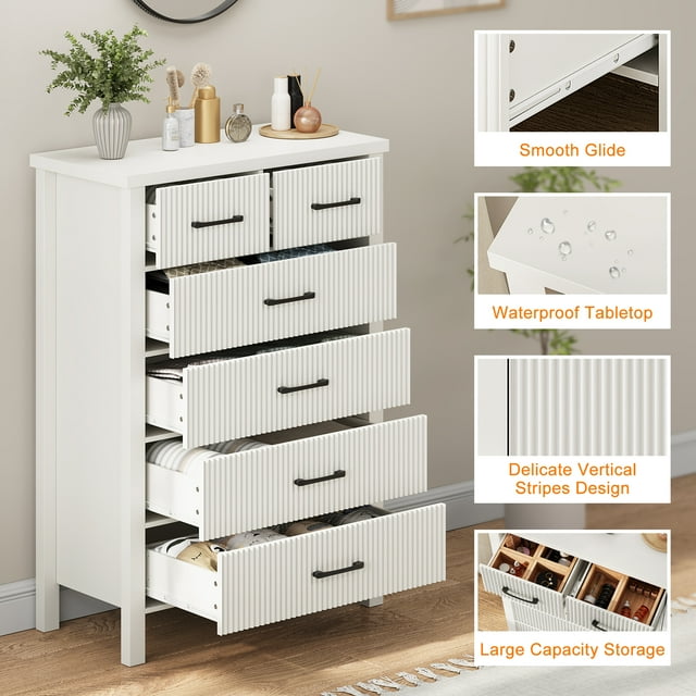 - 【Modern Chic Fluted Design】Embrace the seamless blend of timeless elegance and modern chic with our mesmerizing fluted panel chest of drawers. Crafted with meticulous attention to detail, the distinct fluted panel adds a touch of sophistication and depth to its texture and presence. Designed to elevate your space with its understated yet refined allure, our bedroom dresser becomes a statement piece that seamlessly integrates into your living environment.