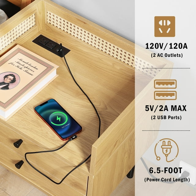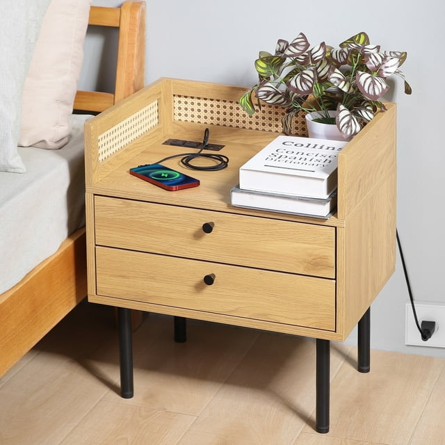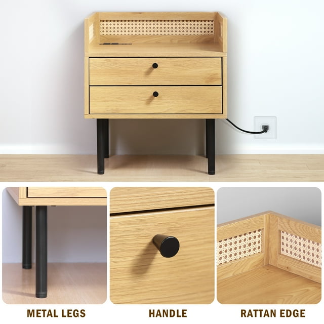 Nifamembo Nightstand with Charging Station & Rattan Edge for Bedroom, Living Room - Natural