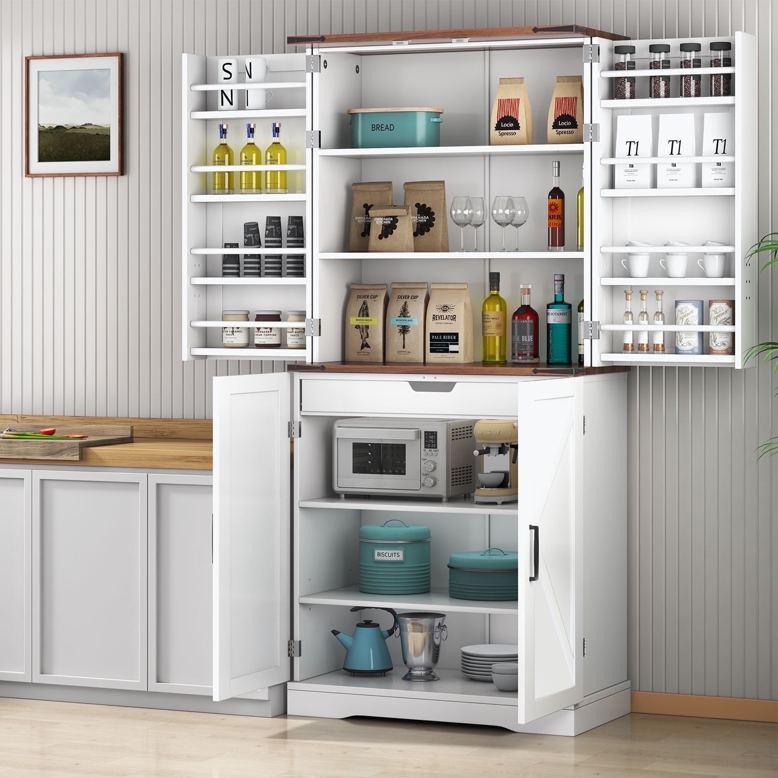 The 70.8'' multifunctional freestanding pantry storage cabinet for kitchen helps you organize your large number of everyday items into an organized collection and is the perfect way to gain extra storage space in your home. With a large capacity storage drawer and two double doors, this white kitchen pantry cabinet with shelves and door can be used to organize towels, shower gels and other toiletries in an orderly manner, and can also be used to store dishes, books and other household items for easy access.