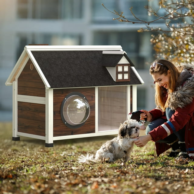 【Sturdy & Stable】The outdoor dog bed is made of 100% natural cedar wood, coated with safe waterproof paint, giving your pet a safe and stable little home. And with plastic wrapped feet, it can protect your floor well if you use the cat house indoor. 【PVC Door Curtain】We customized the exclusive PVC door curtain on the dog cage door, which can effectively block the cold wind and provide a warm home for your little pets. 【Acrylic Dome Viewing Window】The newly upgraded dog pen adds an acrylic dome viewing window, which allows small pets to have a good view of the outdoor scenery in the cat shelter, and the owner can also have a good observation of the pet's growth. 【Waterproof & Windproof】This puppy house features an asphalt roof and high quality curtains, which can withstand the wind and rain and keep the cabin comfortable and dry. Perfect for indoor and outdoor use.