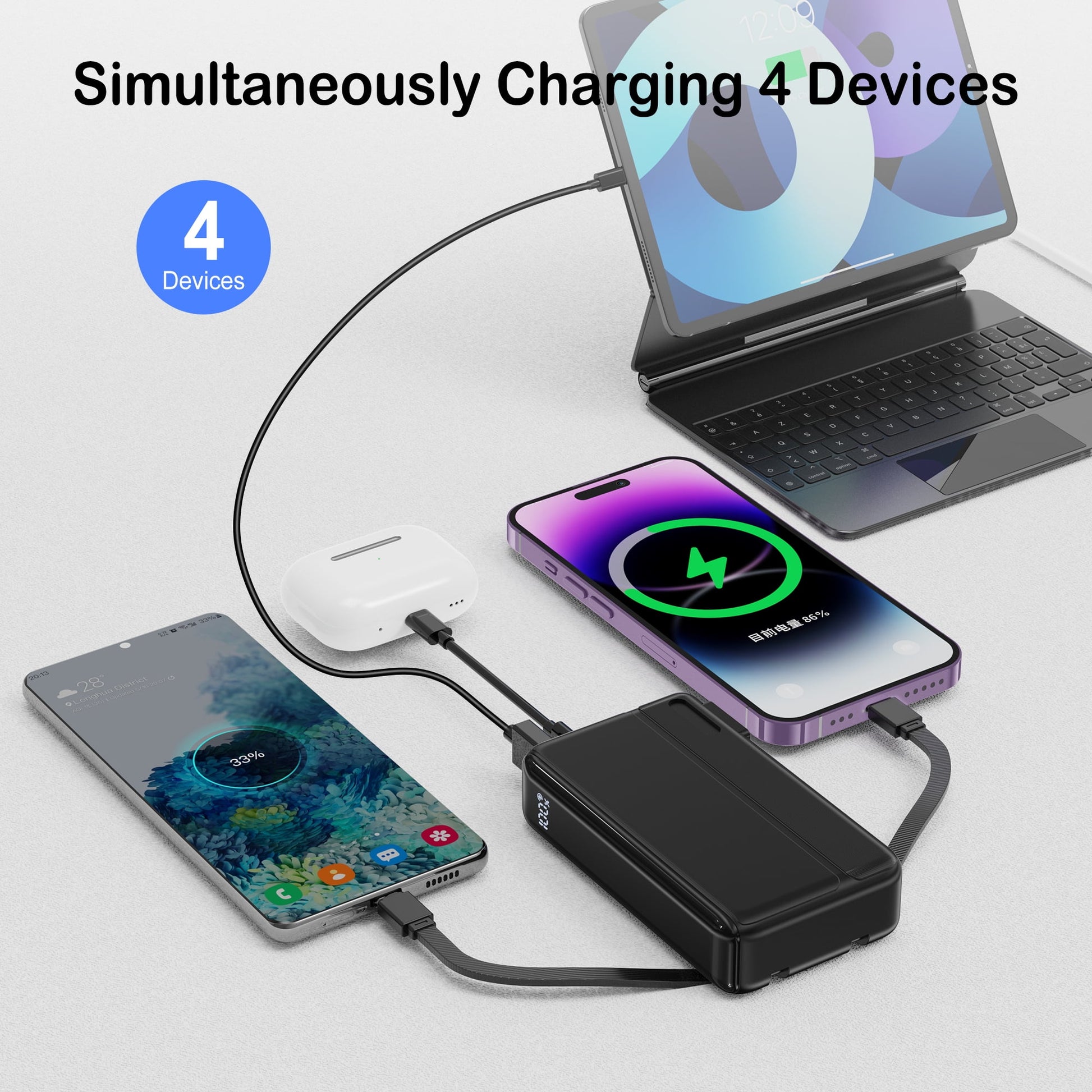 - All-in-One Charging Solution: Equipped with built-in Micro, USB-C, and Lightning cables, plus USB and USB-C ports, making it compatible with a wide range of devices, including iPhones, Android phones, and USB-C devices.