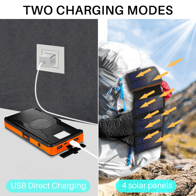 OWNTECH power bank with foldable solar panels, juice up your devices anytime anywhere.No longer worry about power outages outdoors, an essential companion for your off-grid trips.Shockproof: The portable charger is designed with four extra buffer rubber corners, which frees your worry of fall damage while in the wild.IPX5 Waterproof: The waterproof silicone protective line can better protect the internal structure of the portable charger for iphone. The bottom rubber cover also protects the charging ports from rain, water, and dust.Dustproof: Rubber skin-feel oil coating process forms a protective film on the surface, preventing the charger from dust, and also making the touch more comfortable.Sturdy and durable design, the power bank portable charger can withstand harsh outdoor environments. A Must-Have for outdoor activities.